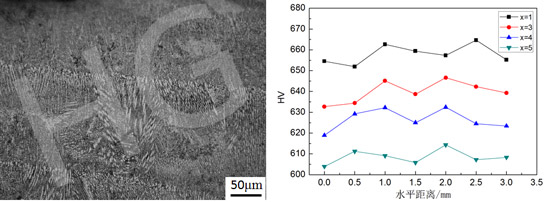 通過(guò)對(duì)高速激光熔覆層的顯微組織進(jìn)行金相及硬度分析,可以看出高速激光熔覆獲得的顯微組織晶粒更加細(xì)小,晶粒越細(xì)化,性能越優(yōu)良。熔覆層的硬度也可根據(jù)具體要求進(jìn)行成分配比的調(diào)整,且硬度均勻,適用于各種硬度需求。
