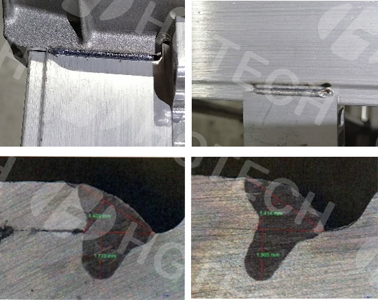 圖2是我司某客戶的鋁合金電池托盤橫縱梁焊接案例,材質(zhì)為6061鋁合金,焊縫接頭形式為搭接接頭,零件均為精加工成型,尺寸狀態(tài)一致性好,若采用CMT焊接,焊后尺寸變形大,無法達到裝車要求。我司采用激光填絲熔焊進行該零件焊接,使用光束質(zhì)量優(yōu)異的激光器,焊接速度可達3m/min,是CMT的3-5倍,而且焊縫成型飽滿,焊接強度與CMT相當,更優(yōu)的,采用激光填絲熔焊后,焊接完成的零件變形小,尺寸一致性高,可良好適配裝車需求。
