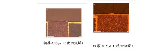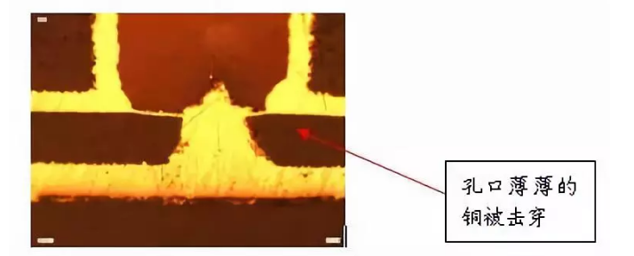 D、對于樹脂與銅分層的問題,我們發(fā)現(xiàn)孔表面的銅厚厚度大于15um時,此類樹脂與銅分層的問題可以得到極大的改善。(如下圖)