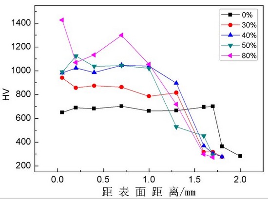 我司開(kāi)發(fā)的新型復(fù)合粉末為鐵基粉末及具有超高硬度的第二相所構(gòu)成,第二相最高硬度可達(dá)到HV2600-3200,因此,該硬質(zhì)相的加入可大大提升熔覆層的整體硬度。同時(shí),經(jīng)過(guò)對(duì)不同比例粉末進(jìn)行多次反復(fù)的試驗(yàn)研究,發(fā)現(xiàn)復(fù)合粉末在一定比例時(shí)得到的超高耐磨合金層可同時(shí)滿足高硬度及結(jié)合面高韌性兩大優(yōu)勢(shì),整體性能最佳。對(duì)熔覆層進(jìn)行微觀分析,發(fā)現(xiàn)其中的硬質(zhì)相比例達(dá)到了70%,耐磨層的平均硬度為HRC64以上,遠(yuǎn)遠(yuǎn)高于基材的硬度,真正做到了內(nèi)里強(qiáng)韌外表超耐磨。