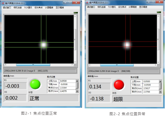 為保證焊接效果,不同焊縫位置焦點差異控制在±0.2mm,焦點位置差異實時顯示在軟件界面上,軟件界面會顯示“綠燈”正常和“紅燈”異常提示,如下圖2所示: