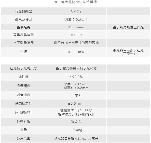 焦點監(jiān)控的工作原理:采用設(shè)備激光器自帶指示紅光,使用相機接收在樣品上反射光的圖像信息,然后通過圖像處理,對光斑位置及相對激光焦點的垂直軸偏移量進行校正,得到線性關(guān)系,從而實現(xiàn)快捷焦點監(jiān)控和校正的功能。焦點模塊的核心技術(shù)指標(biāo)如下表1所示:
