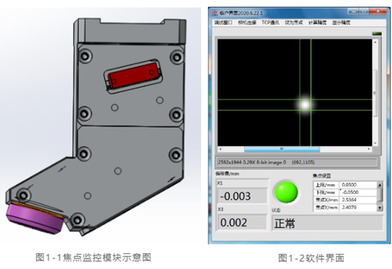 焦點監(jiān)控模塊主要包含相機和控制軟件,其硬件示意圖和軟件界面如下圖1所示:
