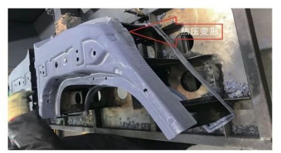 ⑶熱沖壓加工。從加熱爐出來的板料會迅速被機械手夾鉗送至熱成形模具型腔進行沖壓加工,熱成形模具相比冷沖壓模具關(guān)鍵區(qū)別在于多了水路冷卻系統(tǒng),保壓冷卻的過程中(淬火),板料的金相組織會完全變?yōu)轳R氏體組織。馬氏體組織的強度、硬度非常高,熱成形件的抗拉強度可達1500MPa,零件表面硬度可達到52HRC。