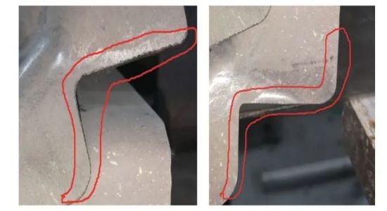 零件實際生產(chǎn)過程中,受熱壓回彈、投料等因素影響,工件存在不同的狀態(tài),數(shù)模編程與實際工件存在一定誤差,是導(dǎo)致拐角(圖8)質(zhì)量較差和燒傷的原因。