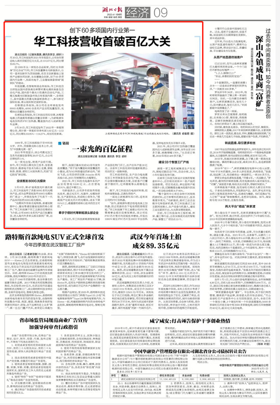 3月30日,華工科技發(fā)布2021年年報,報告顯示,2021年,全年實現(xiàn)銷售收入101.67億,同比增長65.7%,核心業(yè)務均實現(xiàn)了快速增長。自1999年從一家校辦企業(yè)起家,跨入“百億企業(yè)”行列,《湖北日報》以“一束光的百億征程”為題,對華工科技進行了重點報道。