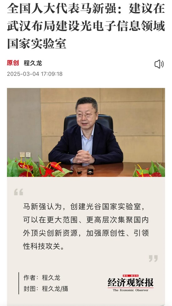 為提升光電子信息領(lǐng)域創(chuàng)新策源功能,塑造光電子信息產(chǎn)業(yè)國(guó)際競(jìng)爭(zhēng)新優(yōu)勢(shì),全國(guó)人大代表、華工科技董事長(zhǎng)馬新強(qiáng)建議,國(guó)家層面要加強(qiáng)光電子領(lǐng)域國(guó)家實(shí)驗(yàn)室的布局。他建議國(guó)家科技部支持武漢以華中科技大學(xué)、湖北光谷實(shí)驗(yàn)室、武漢光電國(guó)家研究中心為基礎(chǔ),協(xié)同湖北九峰山實(shí)驗(yàn)室、湖北江城實(shí)驗(yàn)室以及華為武漢研究所等優(yōu)勢(shì)力量,創(chuàng)建光谷國(guó)家實(shí)驗(yàn)室。