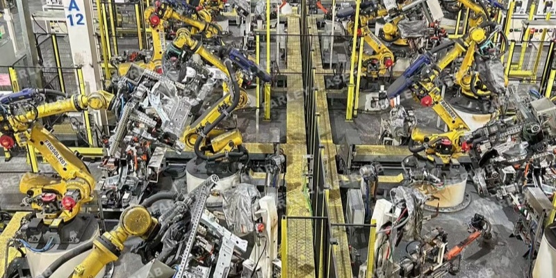 工藝:配置31臺(tái)機(jī)器人,22個(gè)工位,生產(chǎn)節(jié)拍42JPH;兼容三款SUV車型機(jī)艙總成高柔性化生產(chǎn)線。